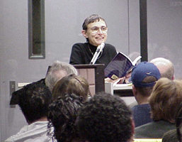 Coping with the waning stages of a bout of bronchitis, Professor Hacker gamely projected to the large audience listening raptly to moving pieces read in the author's expressive voice. Those present had an opportunity to speak with the author at the reception following.